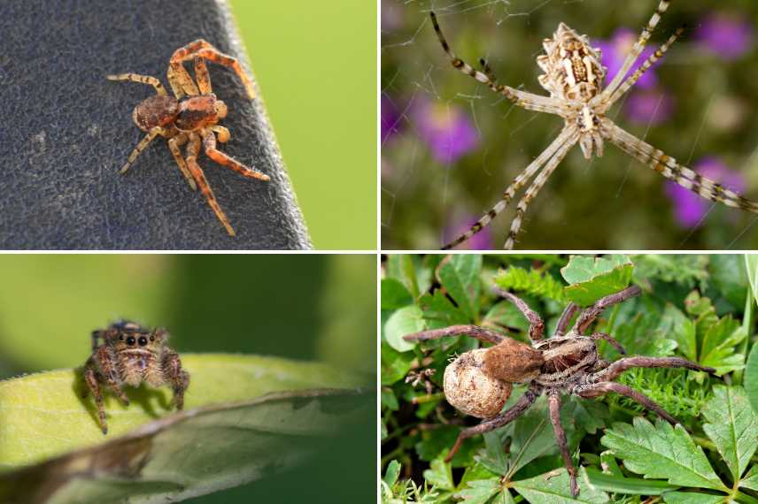 Dans les sens des aiguilles d’une montre, une épeire, une tégénaire et une micrommate