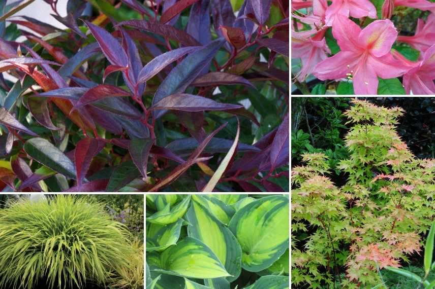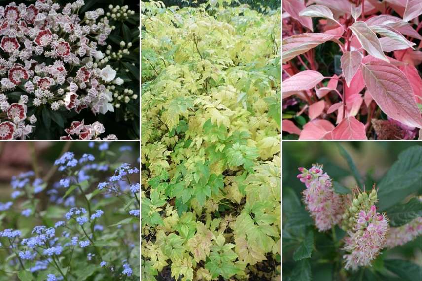 Optez pour des Pieris aux superbes feuillages et aux floraisons décoratives, des camélias qui, pour certains, fleurissent quand les rhododendrons sont moins démonstratifs, ou à des Erables du Japon dont les feuillages gracieux se parent de somptueuses teintes automnales. Complétez avec des vivaces qui habillent le pied des arbustes comme par exemple les Anémones du Japon, les Brunneras, les Cimicifugas, les Coeurs de Marie, les Hostas ou les Heuchères. Comblez les vides avec des bulbes comme la Jacinthe des bois, les Anémones des Bois ou les Cyclamens coum.