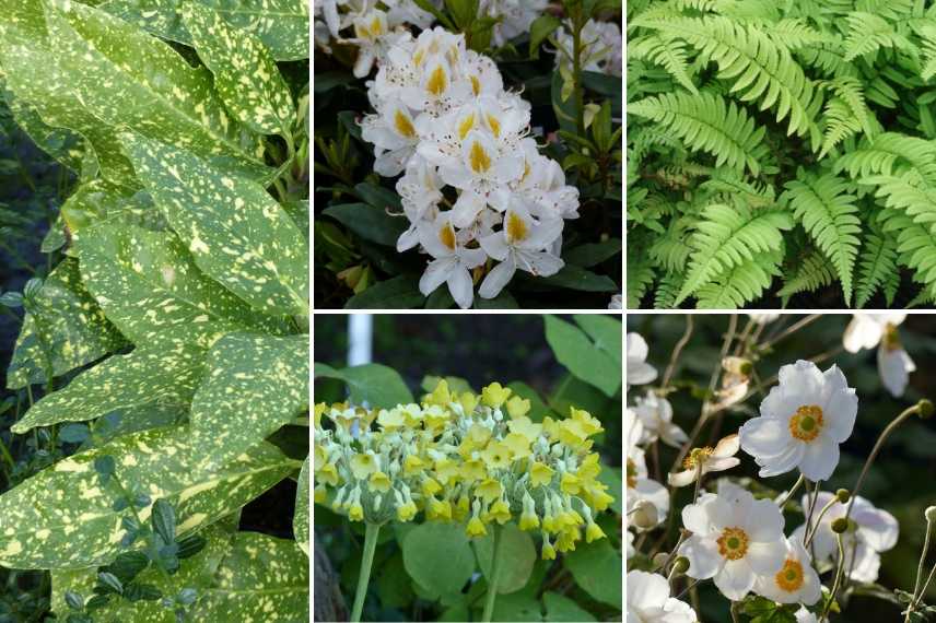 Une idée d’association en terre acide et fraîche : Aucuba japonica ‘Variegata’, Rhododendron ‘Madame Masson’ pour fleurir le printemps, Dryopteris cycadina, Primula florindae pour colorer l’été et Anemone japonaise ‘Honorine Jobert’ pour égayer l’automne