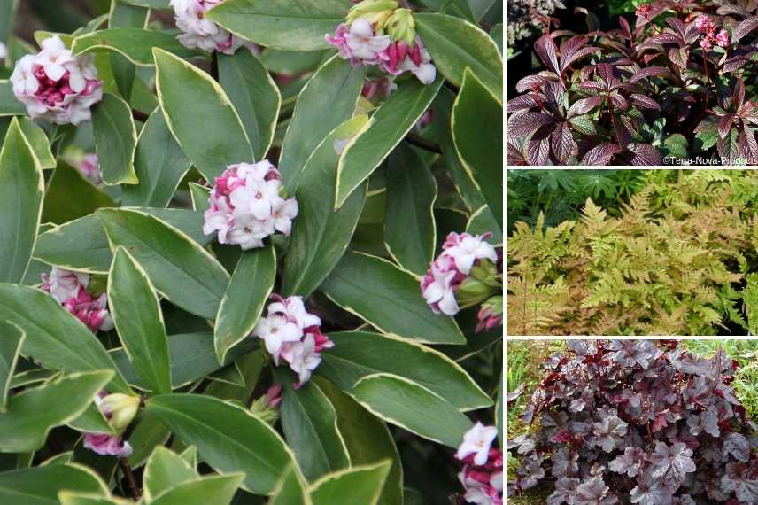 Les fougères (telle la superbe Dryopteris erythrosora au feuillage cuivrée), l’Herbe du Japon, l’Ophiopogon, les Heuchères et les Rodgersias permettent de créer un beau tableau où formes, textures et couleurs de feuillages contrastent à merveille. Complétez avec des vivaces à la belle floraison comme les Hellebores, les Alchemilles et les Anémones du Japon. Des bulbes à floraison précoce accompagnent à merveille la floraison des Daphnés.