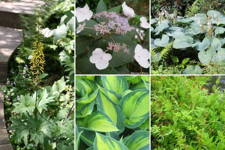 Une idée d’association en ombre fraîche : Ligularia przewalskii, Hydrangea aspera ‘Hot Chocolate’, Hosta ‘Big Daddy’, Hosta ‘June’ et Osmunda regalis ‘Purpurascens’