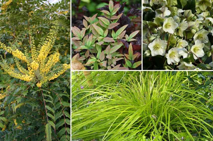 Une idée d’association lumineuse : Mahonia media ‘Charity’, Nandina ‘Obsessed Seika’, Helleborus ‘Ice n’ Roses White’ et Carex oshimensis ‘Everillo’