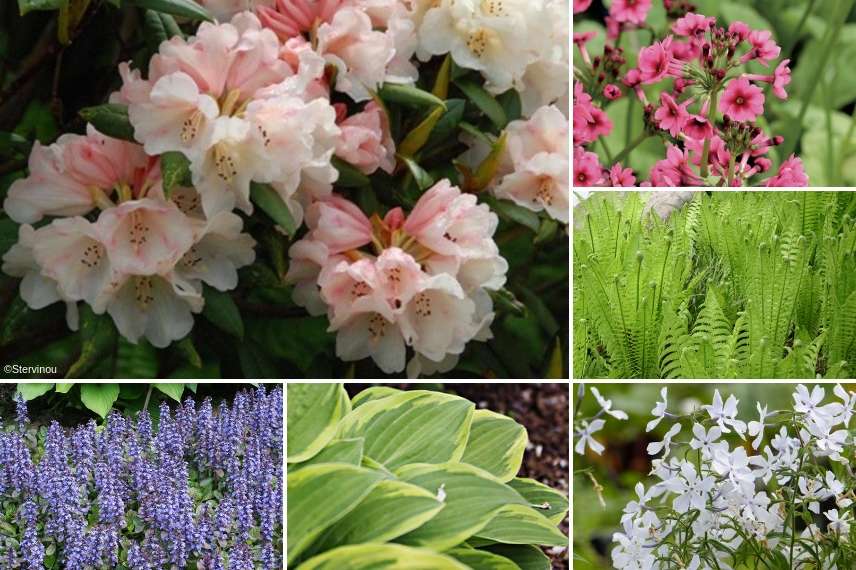 Une idée d’association : Rhododendron yakushimanum ‘Grumpy’, Primula japonica ‘Miller’s Crimson’, Matteuccia struthiopteris, Phlox divaricata ‘White Perfume’, Hosta ‘Fragrant Dream’ et Ajuga reptans