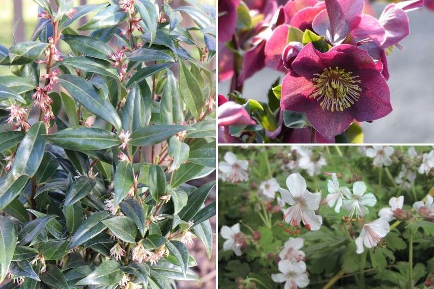 Une idée d’association en zone difficile : Sarcococca ‘Winter Gem’, Helleborus ‘Ice n’ Roses Red’ et Geranium macrorrhizum ‘Spessart’ qui fleurira un peu plus tard en saison
