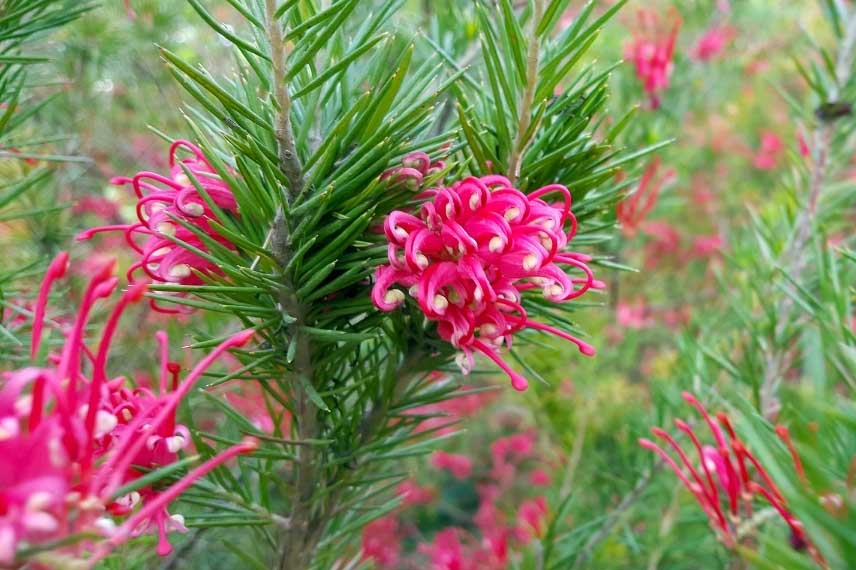 D’une manière générale, les Grevillea portent de belles fleurs découpées aux couleurs vives allant du rouge au rose fuchsia et sont rustiques jusqu’à -10°C en sol drainé. Question de sol justement, les Grevillea les préfèrent drainés, neutres ou acides et supportent sans problème la sécheresse.