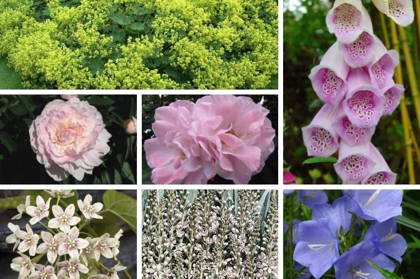 Laissez vous aller à la rêverie… Imaginez un jardin d’inspiration anglaise, traversé par un petit chemin sinueux. Asseyez-vous sur le petit banc et regardez autour de vous. Sur la pergola s’enroule un rosier grimpant Clair Matin , une clématite ‘Henryi’ ou encore un original Wattakaka sinensis. Au pied s’étale un massif en “mixed-border” où les alchémilles Manteau de Notre-Dame (Alchemilla mollis) forment des touffes de feuillage denses qui se marient à merveille avec les campanules à feuille de pêcher (Campanulla persicofolia) ou des digitales qui, comme l’alchémille, se plaisent tout autant à mi-ombre que dans un massif ensoleillé. Quelques lysimaques éphémères (Lysimachia ephemerum) complètent le tableau aux côtés d’une pivoine lactiflora ‘Madame Calot’ à l’indéniable charme romantique.