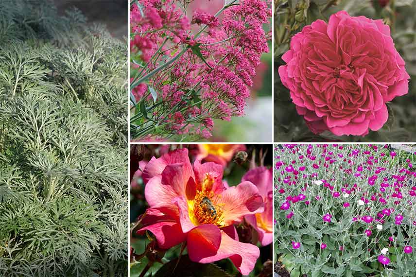 Composez cette autre ambiance romantique autour de l’armoise  ‘Lambrook Silver’ en jouant avec les nuances de gris et de rose. Contrastez le gris des armoises avec le rose des Valérianes des jardins, des coquelourdes des jardins (Lychnis)  et avec des rosiers arbustifs aux couleurs tendres comme ‘The Faun’ ou ‘The Fairy’ ou ‘Soul’ ou pourquoi pas plus pétillantes avec la variété ‘Yann Arthus-Bertrand’.
