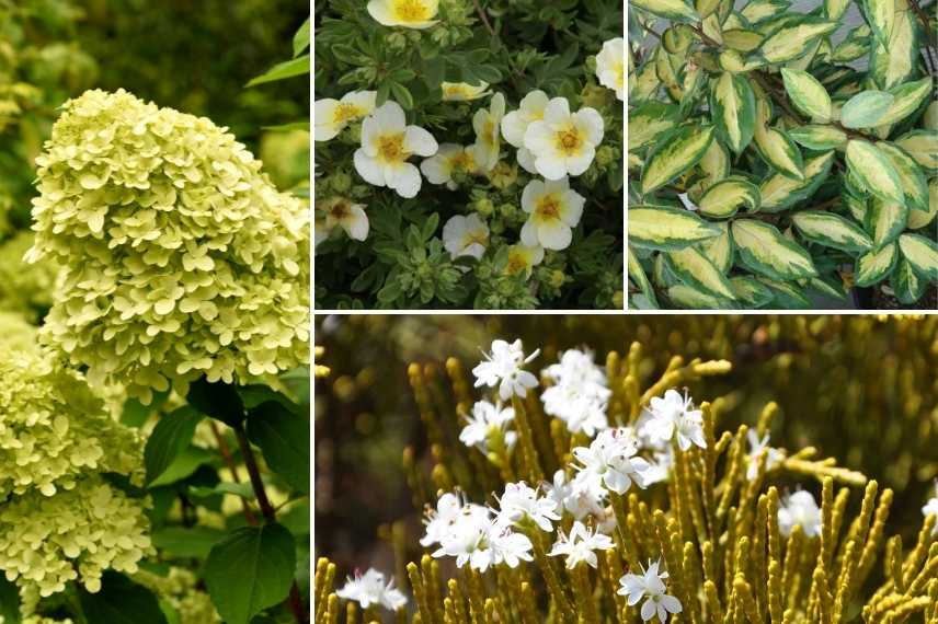 Les inflorescences blanc verdâtre d’un Hydrangea paniculata ‘Limelight’ s’accordent à tous les blancs, qu’ils soient lavés de jaune comme ici une potentille. L’ajout de feuillages verts acidulés ou panachés de crème constitue un bel écrin : ici l’Eleagnus ebbingei ‘Limelight’ et une Hebe ochracea.