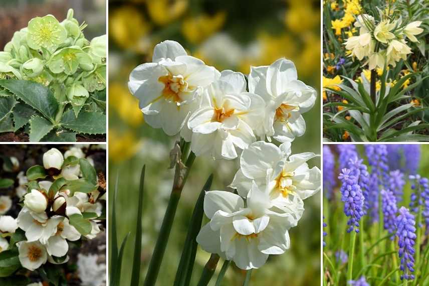 Au printemps, les floraisons blanches se marient à merveille avec des teintes vertes, jaunes et bleues : Helleborus argutifolius, Michelia yunnanensis ‘Gail’s Favorite’, Narcisses à fleurs doubles, Frittilaria ‘Raddeana’ et muscaris.