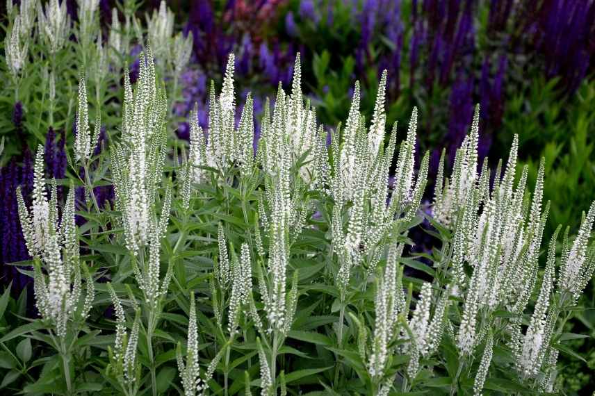 Le blanc éclatant de Veronicastrums sert de faire-valoir aux autres couleurs, en renforçant le bleu profond du second plan