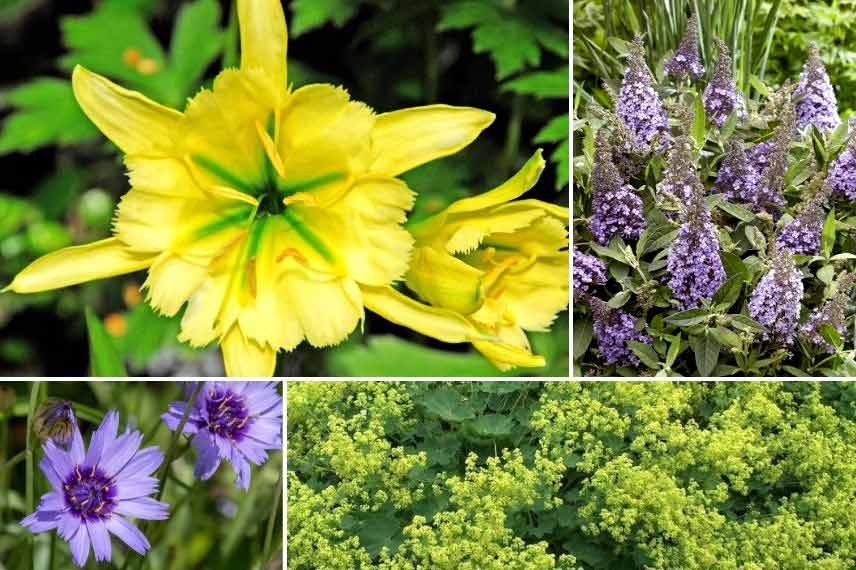 Les compositions faisant résonner en contraste le bleu et le jaune fonctionnent toujours très bien au jardin. L’Ismène jaune ‘Sulphur Queen’ pourra être planté en masse en avant d’un petit arbre à paillons tel que le Buddleja davidii ‘Butterfly Candy Lila Sweetheart’. Cette obtention récente, au port nain et compact (80 cm de hauteur), produit des fleurs en longs épis violets de l’été jusqu’à l’automne, très attractives pour les papillons et les abeilles. Avec sa silhouette élégante et équilibrée, cet arbuste conviendra bien aux petits espaces. Ajoutez l’armoise ‘Oriental Limelight’, une très belle variété panachée de doré, capable de pousser dans toutes les situations. La Catananche caerulea, inconditionnelle du soleil, fleurira généreusement tout l’été avec ses petits capitules bleu lavande intense. Enfin, l’Alchemille ‘Thriller‘ viendra border le tout avec ses douces feuilles vert anis et ses fleurs jaune soufre : une plante facile et pleine de charme, qui mettra en valeur toutes ses voisines !