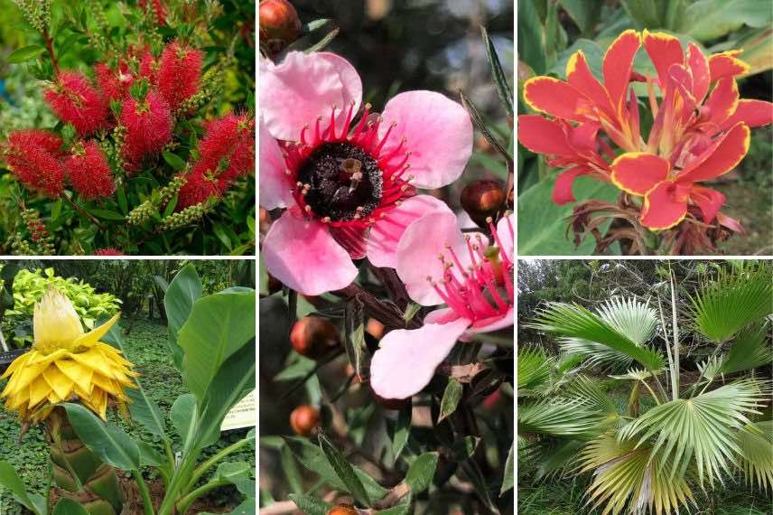 Callistemon laevis, Leptospermum scoparium ‘Martini’, Canna ‘Lucifer’, Musella lasiocarpa, Palmier d’Hawaï