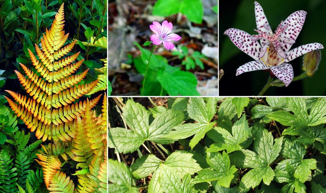 Certains géraniums s’adaptent bien à l’ombre, et permettent de composer une ambiance très naturelle et sauvage. Choisissez par exemple Geranium nodosum. Profitez du graphisme des fougères et hostas pour créer un jardin très luxuriant. Pour apporter un peu plus de couleurs, vous pouvez ajouter des primevères bulleyana, des pervenches ou profiter du feuillage des heuchères. Découvrez aussi la surprenante floraison des Tricyrtis. Utilisez des géraniums en couvre-sol pour fleurir le pied de vos arbres ! Ils empêcheront la pousse de mauvaises herbes, et il ne sera plus utile de désherber ! Avec ses longues tiges rampantes, le Geranium ‘Ann Folkard’ est capable de grimper légèrement sur les arbustes.