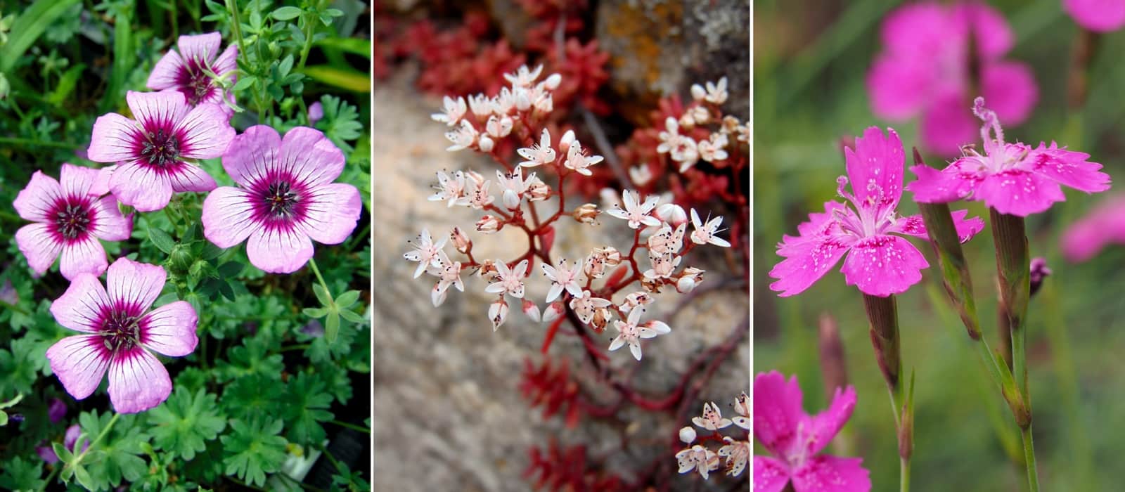 Les variétés les plus adaptées aux sols pauvres et à la sécheresse sont parfaites en rocaille. Vous pouvez ainsi constituer un massif sec et minéral, qui vous demandera peu d’entretien. Choisissez Geranium cinereum, une variété de petite taille, aux feuilles cendrées et arrondies. Elle offre de jolies fleurs roses au cœur pourpre sombre. Disposez un paillage minéral autour d’elle, composé de graviers. Cela maintiendra son collet au sec et évitera qu’il ne pourrisse. Plantez à ses côtés quelques touffes de graminées pour le volume, ainsi que des sédums, et Dianthus deltoides pour la couleur !