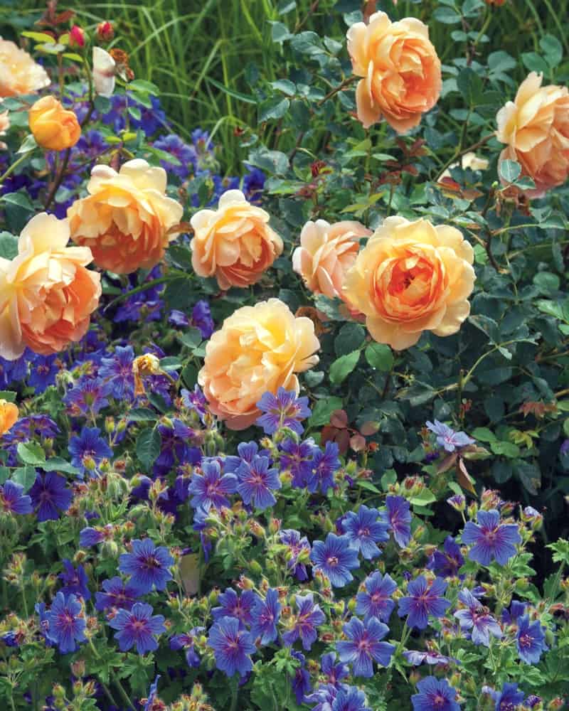 Avec leurs teintes délicates, les géraniums permettent de composer une ambiance romantique. Plantez-les au pied de rosiers buissons ou arbustes. Leurs couleurs s’accordent facilement à celles des rosiers. En plus d’habiller un pied souvent dénudé, le géranium aidera à maintenir un sol frais, sans le concurrencer pour l’eau et les éléments minéraux. De plus, vous n’aurez plus besoin de désherber à son pied ! Vous pouvez utiliser le géranium ‘Ann Folkard’, ses tiges auront tendance à grimper légèrement sur le rosier ! Pour renforcer l’ambiance romantique, plantez à proximité quelques autres fleurs aux tons doux, comme les pivoines, delphiniums, Weigelia florida ‘Variegata’ ou Deutzia gracilis. Vous pouvez réaliser un superbe contraste en associant les fleurs bleu-violet du Geranium x magnificum ‘Rosemoor’ aux fleurs oranges du rosier ‘Lady of Shalott’. Ce sont des couleurs complémentaires, qui se renforcent mutuellement pour créer un effet impressionnant et intense.