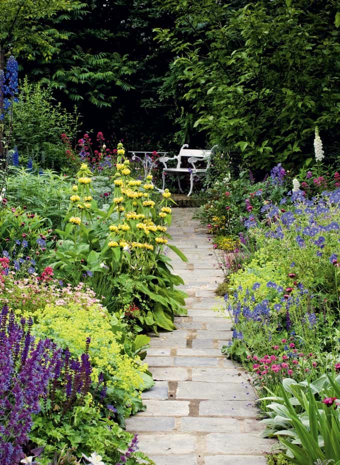 Créez une allée colorée, luxuriante et sauvage ! La floraison bleue du Geranium ‘Johnson’s Blue’ s’accorde à celle du Delphinium. Avec ses grandes hampes florales jaunes, Phlomis russeliana apporte du volume et une touche de couleur vive, faisant écho au ton jaune-vert de la plus discrète Alchemilla mollis. Le Nepeta ‘Walker’ et Centranthus ruber viennent encore rajouter de la couleur à ce tableau. Ces floraisons assez libres cassent la structure du chemin droit et rectiligne, en pierre, y apportant un côté légèrement désordonné mais très naturel. On transforme ainsi une allée droite, monotone, presque ennuyeuse, en un chemin à l’aspect vivant et libre, coloré et pétillant !