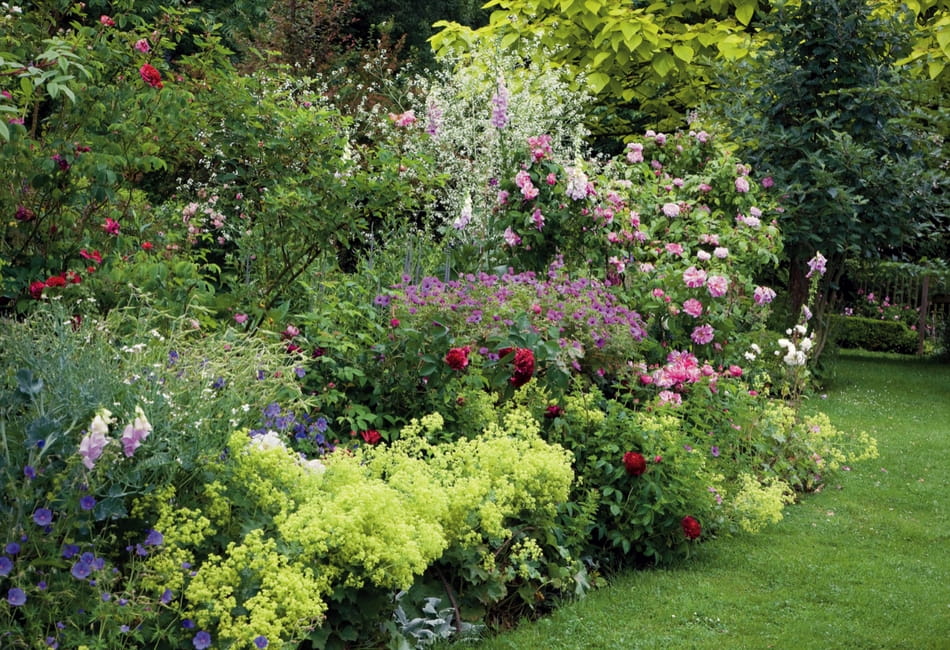 Profitez des géraniums pour créer un massif romantique, aux teintes douces et harmonieuses. Le géranium ‘Patricia’ s’accorde avec la floraison des Rosa versicolor et des Digitalis purpurea, apportant douceur et romantisme. Les rosiers donnent de la hauteur à l’ensemble, tandis que les alchémilles agrémentent le devant du massif. La floraison surprenante de Crambe cordifolia illumine le massif, en y amenant beaucoup de légèreté. L’ensemble crée une belle harmonie de tons rose, bleu, mauve et blanc.