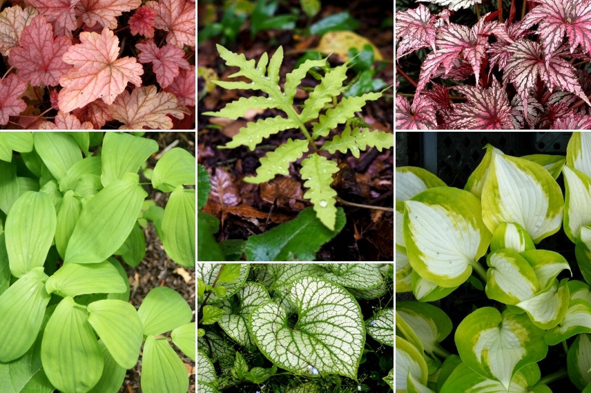 Heuchère ‘Vienna’, Onoclea sensibilis, Begonia ‘Angel Plum’, Uvularia grandiflora (photo David J. Stang), Brunnera ‘Jack Frost’ (photo Manuel M.V.) et Hosta ‘Summer Music’