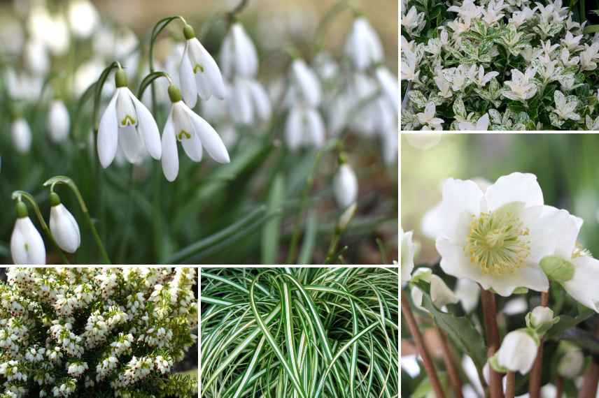 Blancheur et douceur ! le blanc et les nuances de vieux rose à rose pimpant sont les couleurs antidotes au mauvais temps et au paysage dénué de feuillages. On les retrouve dans les 3 plantes suivantes, restant de petite taille, indispensables compagnons des jardinières d’hiver : bruyères (plutôt au soleil), hellébores et Skimmia (à ombre ou mi-ombre). Pour ce dernier, fleurissant en fin d’hiver, mais présentant de beaux boutons floraux très ornementaux tout l’hiver, choisissez des variétés naines comme ‘Godrie’s Dwarf’ ou ‘Magic Marlot’.