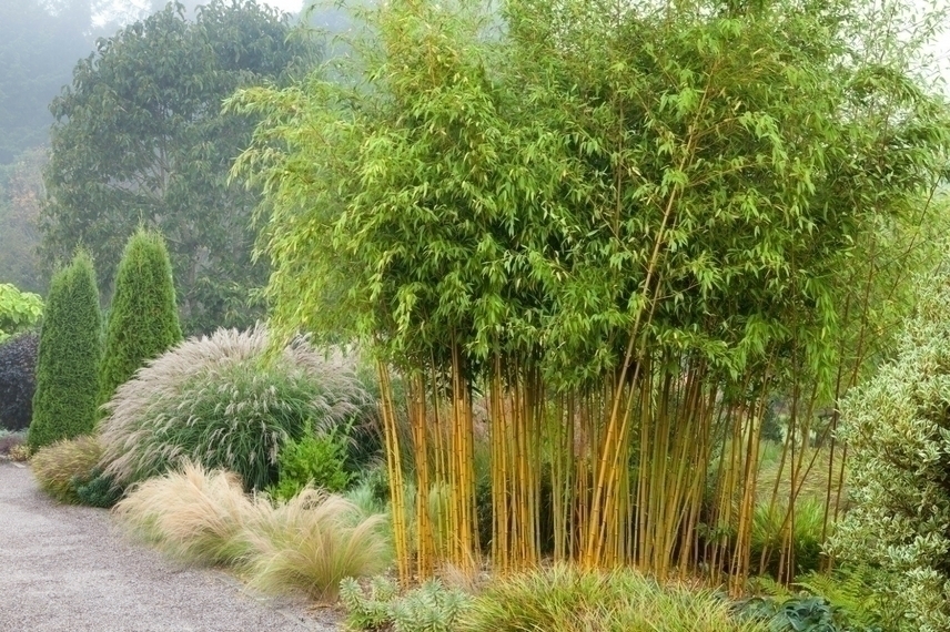 Phyllostachys aureosulcata ‘Aureocaulis’ en premier plan en compagnie de Miscanthus sinensis et Stipa tenuifolia (Copyright: Richard Bloom/ GAP Photos)