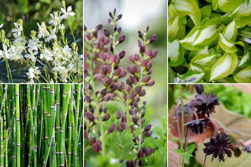 Les Baptisias à fleurs sombres ou à fleurs blanches entrent facilement dans la composition d’un jardin graphique et moderne. Gaura lindheimeri ‘Snowbird’, Equisetum hyemale, Baptisia ‘Dutch Chocolate’, Hosta ‘Summer Music’, Aquilegia ‘Black Barlow’