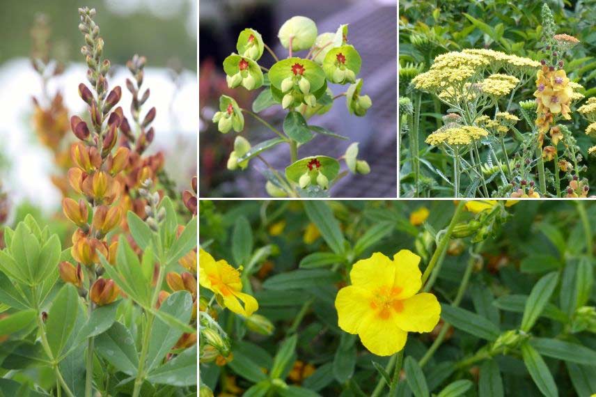 Comme le baptisia se montre résistant à la sécheresse et qu’il supporte plutôt bien les sols pauvres, il peut s’intégrer dans un jardin sec ou une rocaille, en compagnie d’autres plantes peu exigeantes. Choisissez par exemple des Eryngiums, euphorbes, Achillées, Perovskia, Salvia nemorosa ‘Caradonna’… Pensez aussi aux fleurs lumineuses des hélianthèmes, ces buissons nains qui se couvrent du printemps jusqu’en fin d’été de fleurs aux teintes vives : jaune, rose, rouge, orangé… Intégrez des Verbascum, pour leurs grandes hampes florales dressées, très structurantes. Pour apporter de petites touches de couleur, pensez à la coquelourde, ou Lychnis coronaria, qui offre un feuillage argenté et des fleurs d’un rose profond et très vif.