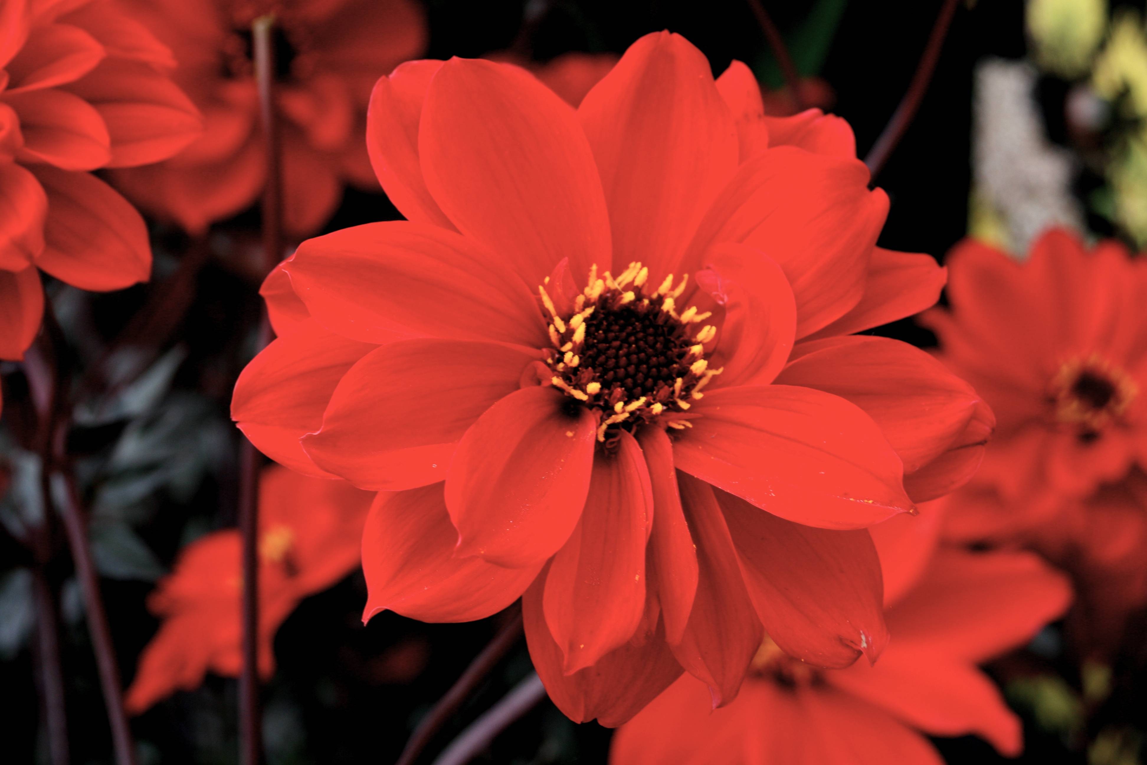 - Dahlias nains à collerette : dépassant rarement les 60 cm, avec leur port compact et leur fleurs munies d’une jolie collerette, ils sont radieux en premier plan de massif ou en bordure et sensationnels en pot sur une terrasse ou un balcon au soleil.