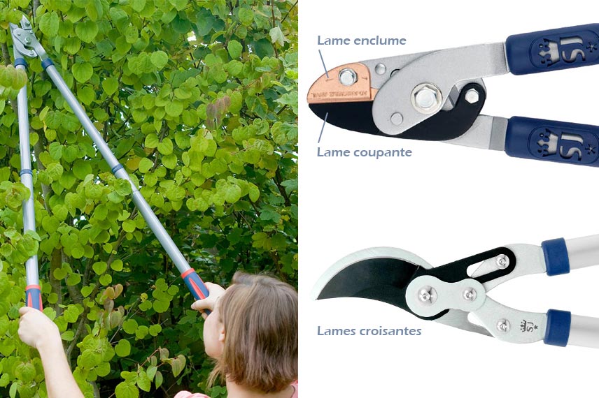 Ce sont des gros sécateurs que l’on actionne à deux mains. Ces outils sont utilisés pour couper des branches d’un diamètre plus important au-delà de 2,5 à 3 cm de diamètre. Les poignées sont plus longues voire télescopiques selon les modèles, ce qui permet de sectionner des branches situées en hauteur sans échelle.