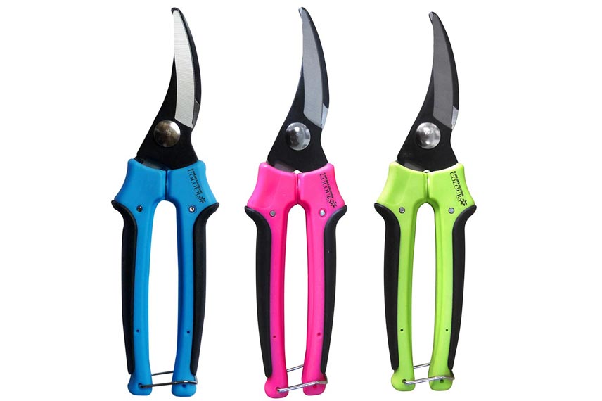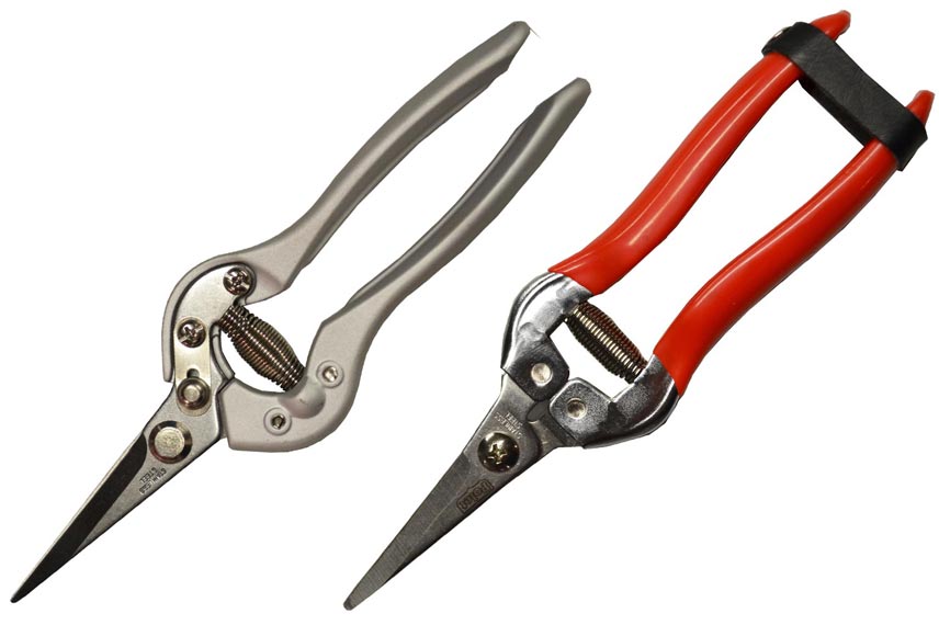 - les sécateurs à lames croisantes ou à coupe franche pour la coupe de bois vert, la taille des rameaux et tiges vertes, encore souples. Ils conviennent parfaitement à la taille des sujets vivants jusqu’à 2,5 cm de diamètre de type rosiers, fruitiers, vignes et petits arbustes mais également à celle des grimpants et vivaces dont la taille nécessite des petites coupes répétitives. Ils sont parfaits pour la cueillette des fleurs, des herbes, des légumes et des fruits ainsi que pour l’entretien des topiaires. Dans cette catégorie, on distingue le sécateur à crémaillère et le sécateur à ressort (celui-ci est placé entre les deux poignées, la plupart sont de ce type)