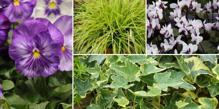 Accompagnez vos bisannuelles d’automne de feuillages décoratifs et persistants : lierre, fougères persistantes, heuchères, petites graminées type Carex, etc. Dans un panier suspendu, vous pouvez installer quelques pensées qui vont se mêler au feuillage léger et lumineux d’un Carex ‘Everillo’. Ajoutez un lierre panaché de jaune pour rappeler la couleur de la graminée. Installez-le au bord pour le laisser cascader du panier. Terminez par la plantation de bulbes de cyclamens aux jolies feuilles tout en rondeur. Cerise sur le gâteaux, ils vous offriront leurs petits papillons blancs en fin d’hiver.