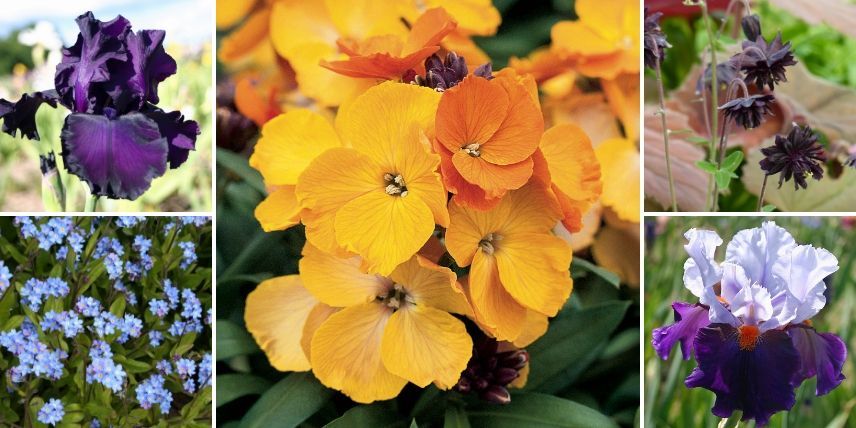 Un exemple d’association : Iris germanica ‘Midnight Revelry’, Myosotis, Erysimum ‘Rysi Copper’, Aquilegia ‘Black Barlow’ et Iris germanica ‘Chelsea Bleu’