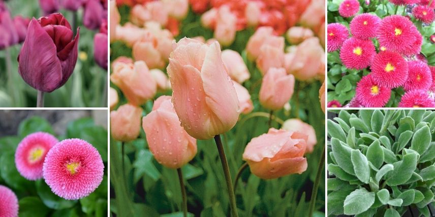 Un exemple d’association : Tulipe triomphe ‘Purple Lady’, Bellis perennis ‘Rose’, Tulipe ‘Apricot Beauty’, Bellis perennis ‘Tasso Rouge’ et Stachys ‘Silver Carpet’