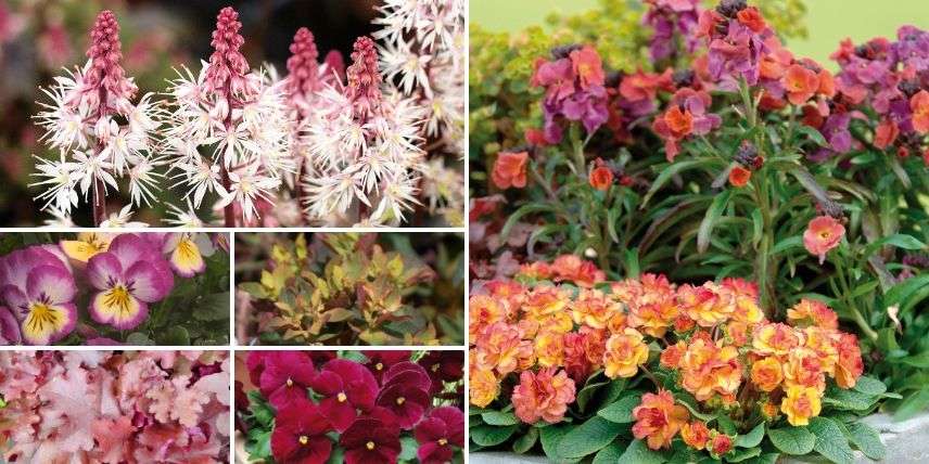 Les bisannuelles d’automne offrent une belle gamme de formes et de couleurs variées. Vous pouvez parfaitement les associer entre elles. Pour cela, alliez les grappes de petites fleurs des giroflées à celles plus sophistiquées des primevères très doubles. La variété ‘Winter Orchid’ nous enchante avec ses fleurs aux nuances irrésistibles et très parfumées ! Elle se marie à merveille avec la primevère ‘Belarina Nectarine’ pour une harmonie délicieusement fruitée. Ajoutez une touche supplémentaire de charme et de graphisme avec une tiarelle et une euphorbe pourprée. Enfin, complétez la scène avec des heuchères aux tonalités changeantes au fil des saisons, sans oublier quelques pensées.
