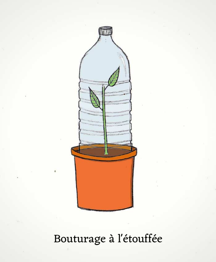 On place souvent les boutures « à l’étouffée », en installant une bouteille en plastique ou un sac plastique par-dessus, afin de conserver une atmosphère saturée en humidité.
