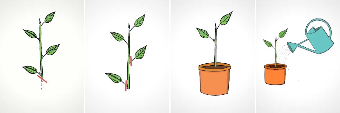 Pour effectuer des boutures de tiges : 1/ Couper une tige juste sous un noeud. 2/ Supprimer les feuilles basales. 3/ Placer la bouture en terre. 4/ Veiller à ce que le substrat reste légèrement humide, en arrosant de temps en temps.