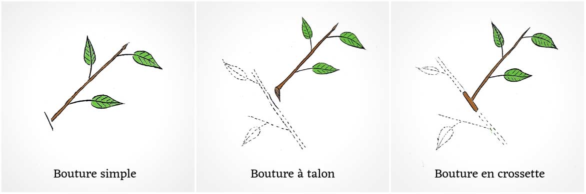 Une autre technique alternative, assez proche, est le bouturage en crossette. On prélève ici une tige avec une vraie section (entre 1 et 2 cm de long) de la branche sur laquelle elle est insérée, ce qui donne une forme en T. Cette technique marche bien pour les cistes, sureaux, oliviers, figuiers, vigne, berbéris, arbousiers…