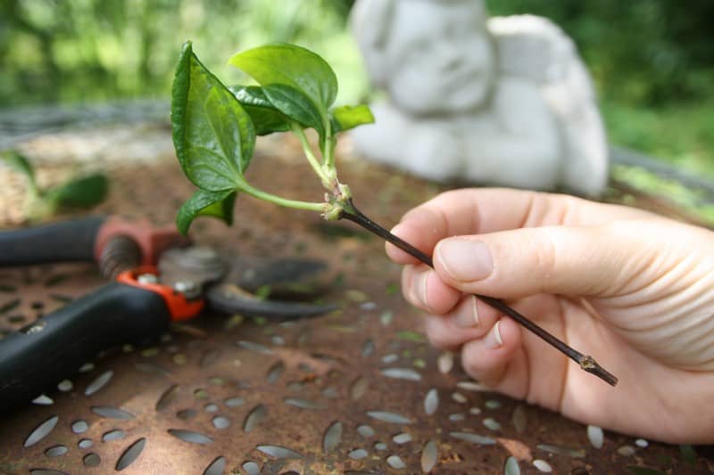 - Coupez une tige d’une quinzaine de centimètres de longueur, comprenant au moins deux bourgeons, avec un couteau ou sécateur. À la différence d’autres plantes, vous pouvez couper au milieu d’un entre-nœud.