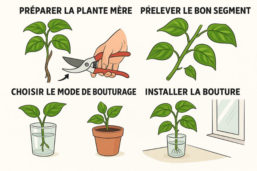 | Étapes clés | 1) Prélever sur plante saine 2) Couper sous un nœud 3) Retirer les feuilles basses 4) Eau ou substrat 5) Lumière douce + humidité. |