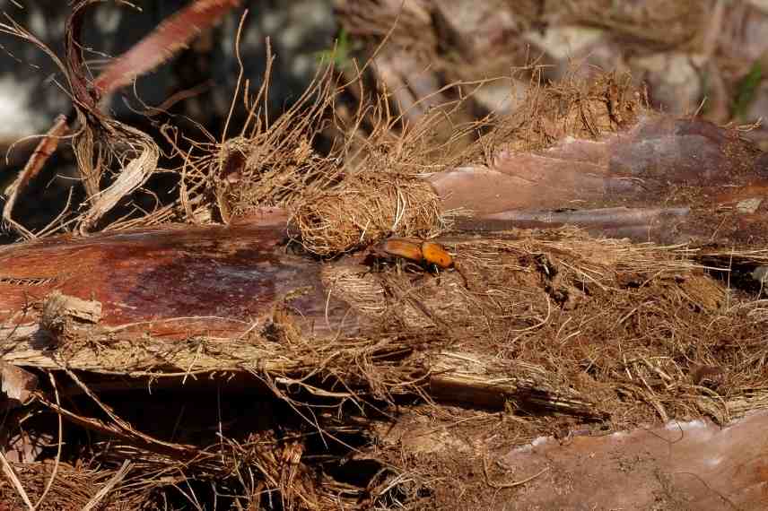 Originaire d’Océanie et introduit par accident en France en 2006, le charançon rouge du palmier –Rhynchophorus ferrugineus- est devenue une véritable hantise des pépiniéristes, des communes ainsi que des propriétaires de ces végétaux exotiques. Capables de s’attaquer à plus d’une dizaine d’espèces différentes de palmiers, ce coléoptère phytophage est capable de venir à bout d’un sujet en 2 ans seulement. Ce voyageur lointain ayant profité du commerce international pour se faufiler en Europe, est devenu le plus grand Curculionidé de nos contrés. La loi prévoit une obligation de la part des collectivités locales de combattre cette espèce invasive lorsque sa présence est avérée ou soupçonnée sur le territoire concerné.
