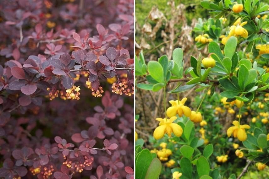 À gauche : le Berberis thunbergii ‘Atropurpurea’ au feuillage caduc et pourpre. À droite : Berberis buxifolia ‘Nana’ au feuillage persistant et vert