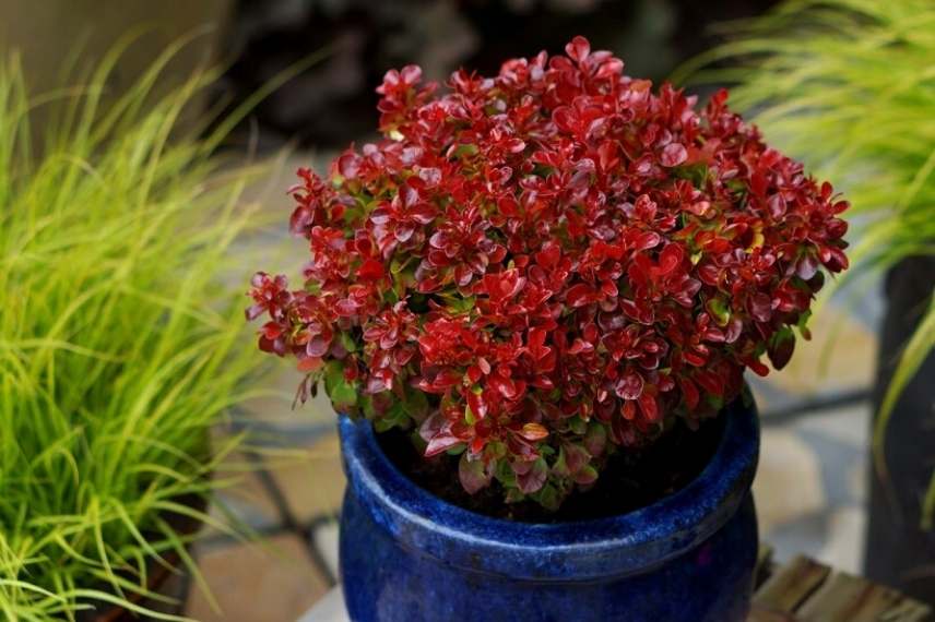 la petite taille du Berbéris thunbergii ‘Lutin Rouge’ convient parfaitement à une culture en pot