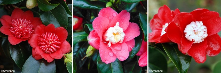Camélias ‘Yuletide’, ‘Sunny Side’ et ‘Versicolor’