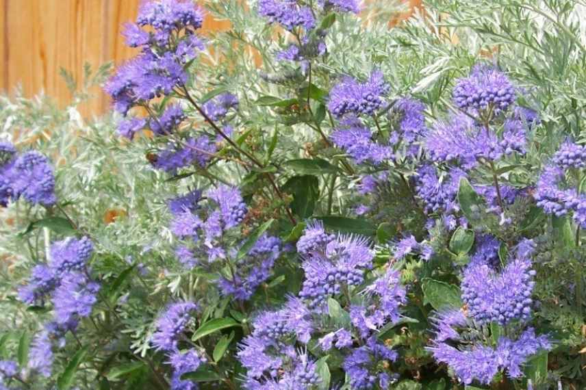 - Le Caryopteris clandonensis ‘Sterling Silver’ est l’une des plus hautes variétés avec son 1,20 m de hauteur pour 90 cm de largeur. Il est splendide avec son feuillage gris-argenté et sa floraison bleu-violet intense.