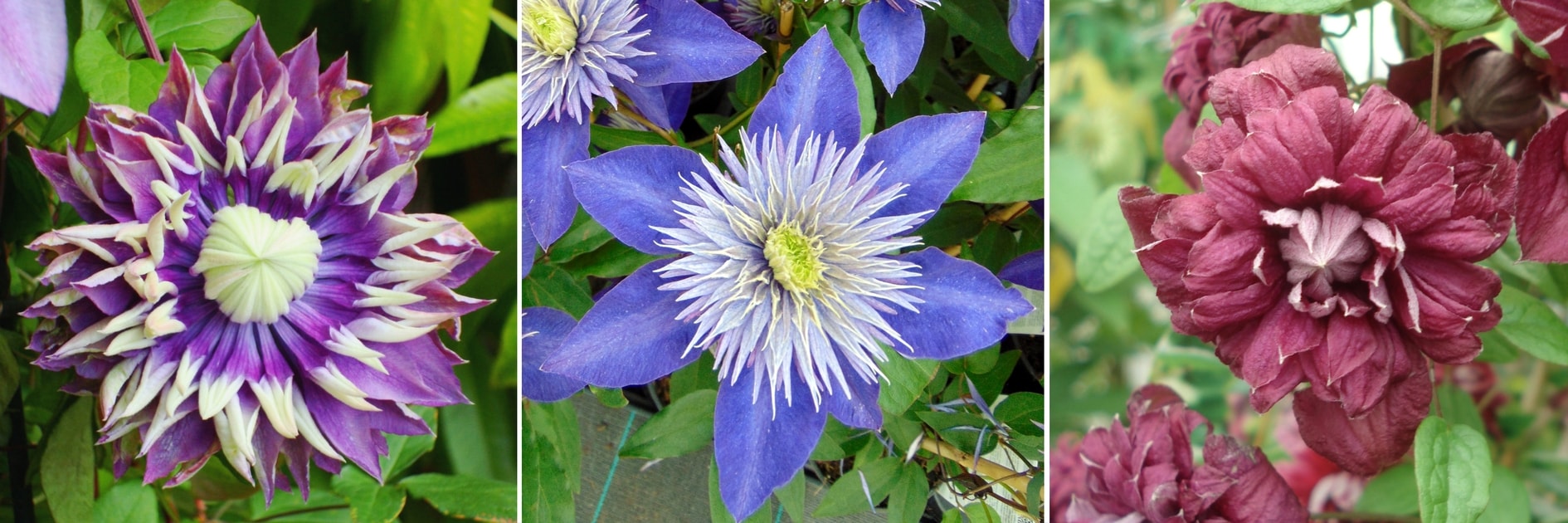 Clematis ‘Taiga’, Clematis ‘Multiblue’ et Clematis ‘Purpurea Plena Elegans’