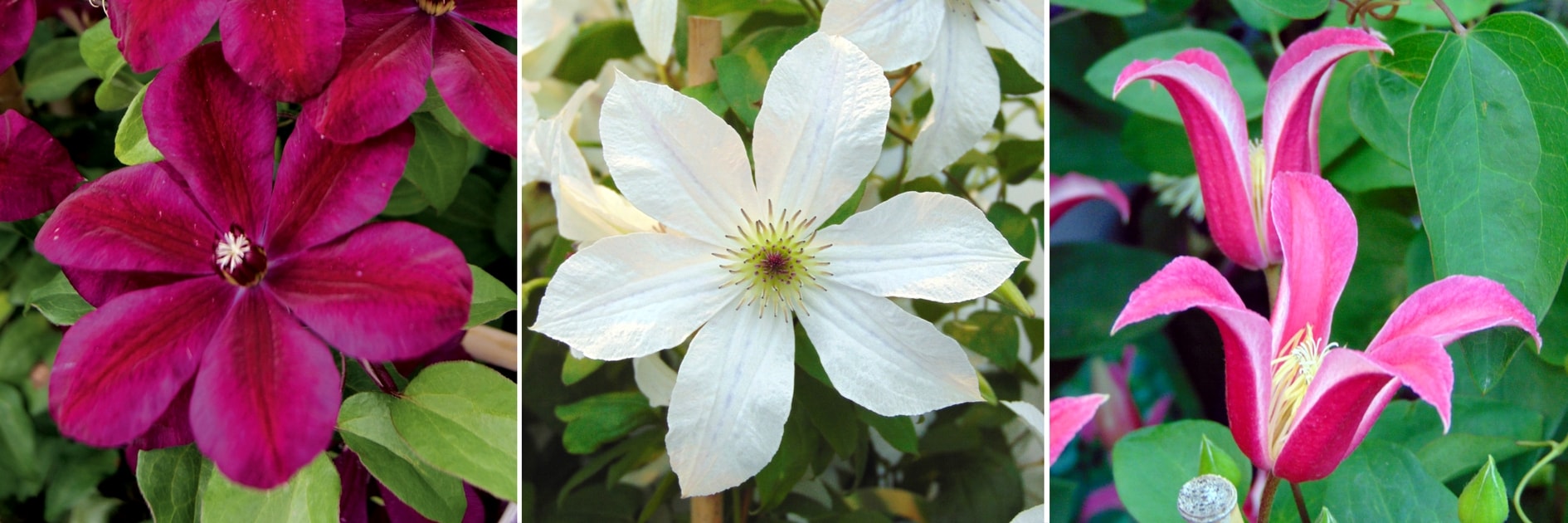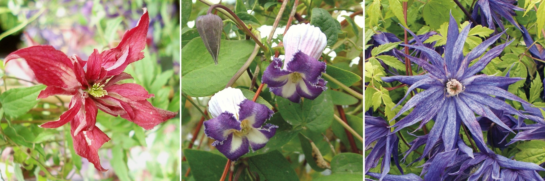 Clematis ‘Westerplatte’, Clematis jackmanii ‘Forever Friends’ et Clematis texensis ‘Princess Diana’