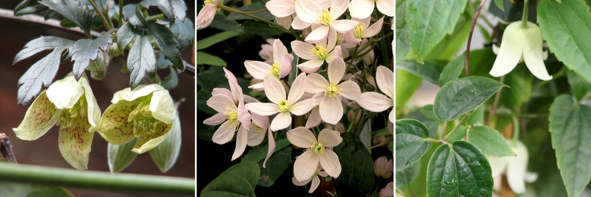 Clematis ‘Winter Beauty’, Clematis cirrhosa ‘Freckles’ et Clematis armandii ‘Snowdrift’