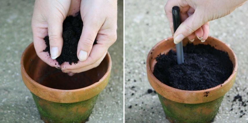 - préparez un pot en terre cuite avec un mélange de terreau et de sable de rivière ou d’un bon terreau à semis,