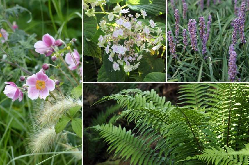 Une idée d’association : Anemone ‘September Charm’, Hydrangea involucrata ‘Yoraku Tama’, Liriope muscari ‘Ingwersen’, Dryopteris wallichiana