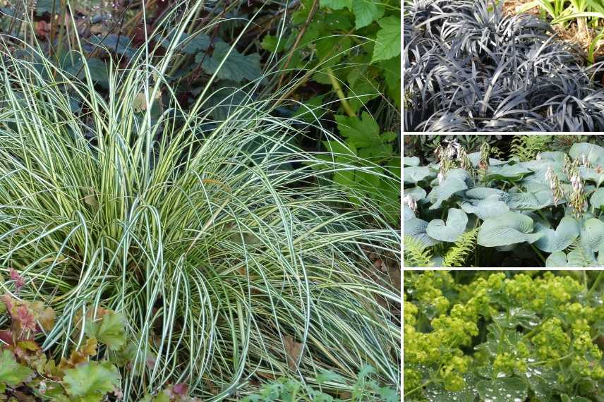 Une idée d’association : Carex oshimensis ‘Evergold’, Ophiopogon planiscapus ‘Nigrescens’, Hosta ‘Big Daddy’, Alchemille mollis