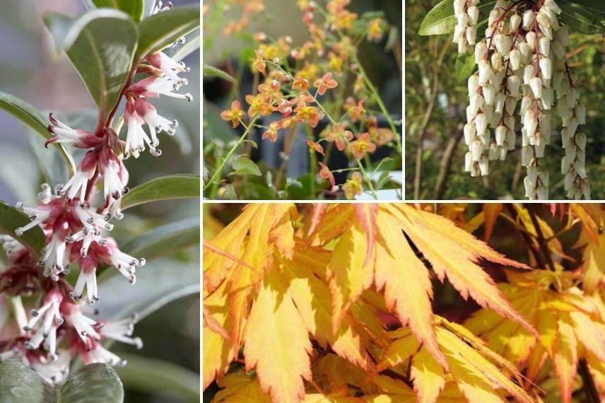 Une idée d’association : Sarcococca ‘Winter Gem’, Epimedium pubigerum ‘Orangekönigin’, Pieris japonica ‘Mountain Fire’, Acer palmatum ‘Orange Dream’